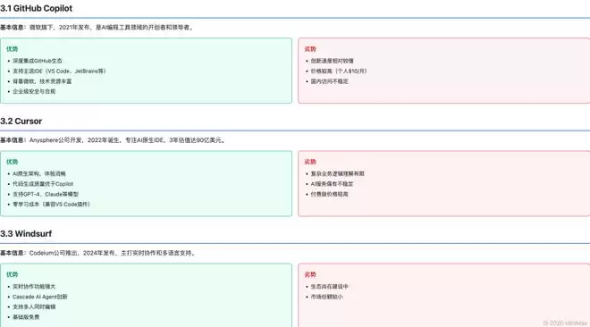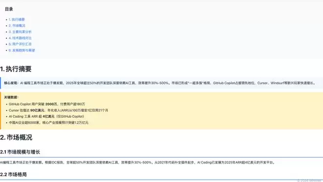 这是最终的报告成果,可以看到,整体条理非常清晰,包含执行摘要、市场概况、玩家分析、用户评价等 6 大模块,不仅精准提炼了 GitHub Copilot(2000 万用户、180 万付费用户)、Cursor(90 亿美元估值、21 个月 ARR 从 100 万到 1 亿)等核心数据,还对三款主流产品做了优势 - 劣势 - 用户满意度的结构化分析,甚至能精准总结出 Cursor 数学建模准确率 87.6%、通义灵码中文注释支持好等细节。