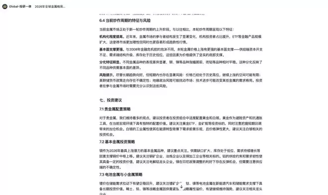 它不仅精准分析了黄金(央行购金 + 避险需求)、白银(工业属性 + 金融属性双重驱动)的上涨逻辑,还对铜(供需缺口)、锂(储能需求)、稀土(高端制造溢价)等金属做了细分分析;甚至梳理了历史金属涨价周期的规律(通常 8-10 年,当前仍处于长周期上涨阶段),并对本轮炒作周期的特征(机构化程度提高、基本面支撑更强、分化特征明显)和风险(价格高位、美联储政策不确定性)做了全面分析,最后还给出了贵金属、基本金属、电池金属的具体投资建议。对于普通投资者来说,这相当于拥有了一个专属的专业投研团队。