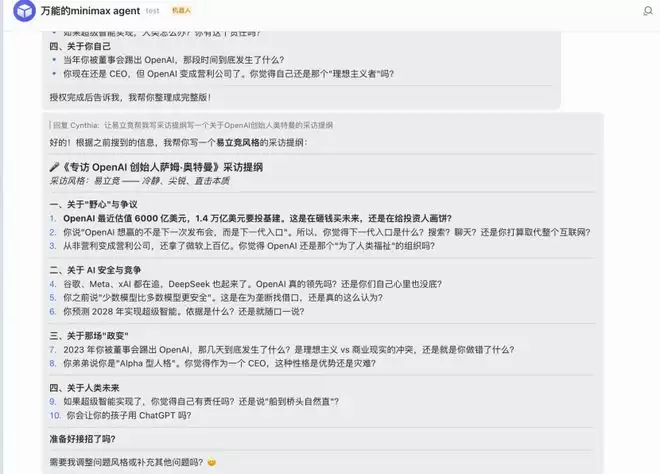 这里。我让它根据我自己创建的采访提纲机器人,做了一份关于萨姆・奥特曼的采访。