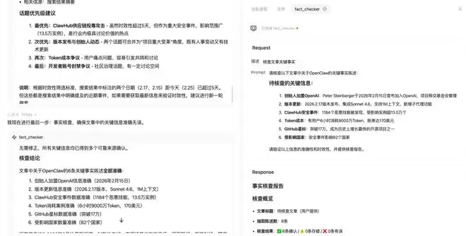 更重要的是,它内置了事实核查子 Agent,在成果输出前会对所有关键信息进行交叉验证,确保信息的准确性,彻底解决了 AI 投毒的问题。实测中,AI 对 OpenClaw 的星标数据、功能特点、行业影响等信息,都做了信源标注和事实核查,没有出现任何虚假信息。