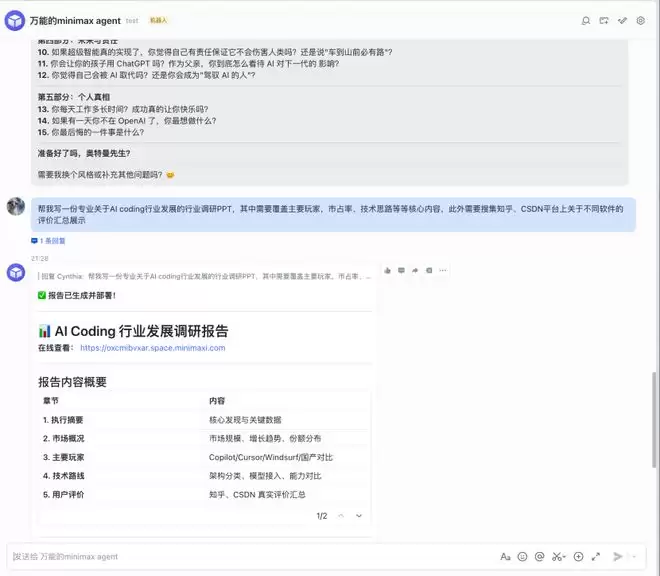 当然,用户不仅能自由创建 Expert,还能将自己的 Expert 开放共享。目前,MiniMax 已经构建起了一个充满活力的 Expert 生态:已有1 万 + 公开的专家 Agent,其中大部分来自 UGC 创作,甚至包括投研分析、行业报告、代码开发等高质量的专业 Agent。