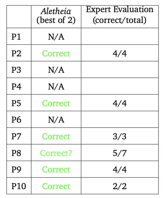 Aletheia A 与 Aletheia B 针对相同的六道题目都生成了候选解答。单独来看,每个智能体都至少出现过一次「假阳性」(false positive),但在 best-of-2 的评估机制下,它们共同为六道题目都提供了可信的解答。这一结果相比 2025 年 12 月用于解决 Erdős 问题的 Aletheia 版本,在准确率上有明显提升。