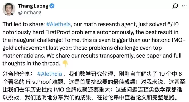 曾带队实现 AI IMO 金牌成绩的 DeepMind 超人类推理方向负责人 Thang Luong 表示,这一成果的分量超过去年 AI 在 IMO 测试中获得金牌的表现。