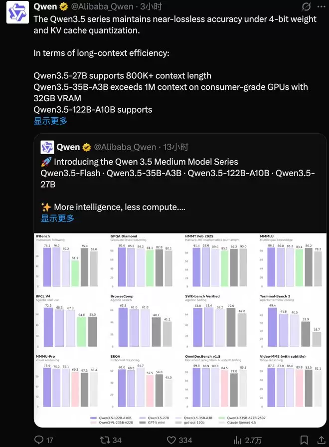 继除夕开源 Qwen3.5-397B-A17B 之后,阿里在2月25日继续开源千问3.5系列模型,一口气发布了三款中等规模的新模型,分别是Qwen3.5-35B-A3B、Qwen3.5-122B-A10B以及Qwen3.5-27B。