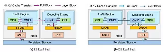 在具体实现上,DualPath在每个预填充引擎和解码引擎上预留少量DRAM作为缓冲区。对于预填充端读路径,命中token的KV缓存首先从存储读入预填充引擎缓冲区,然后按层流式传入预填充引擎的HBM,与未命中token的KV计算过程重叠执行。随后,完整的提示词KV会被传输至解码引擎缓冲区,供解码阶段使用。