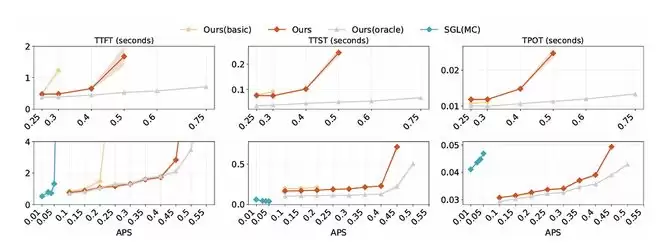 在改变追加长度和生成长度时,DualPath在短token场景下优势更明显。随着追加长度增加,GPU计算压力增大,而生成长度增加则因预填充间隔变长,降低了KV缓存加载压力。