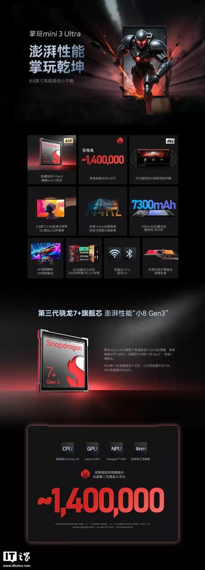 作为对比,酷比魔方现款掌玩 mini 3 Ultra 平板采用高通骁龙7+ Gen 3处理器,配备12GB运行内存和256GB存储空间,内置7300毫安时电池(支持18W快充),目前市场售价为1699元。