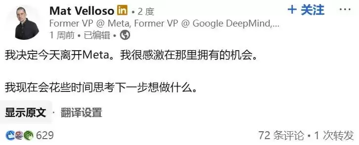 Mat Velloso:曾任Meta超智能实验室开发者平台产品负责人。他去年7月从Google DeepMind加入Meta,但仅在岗数月便在上周宣布离职。