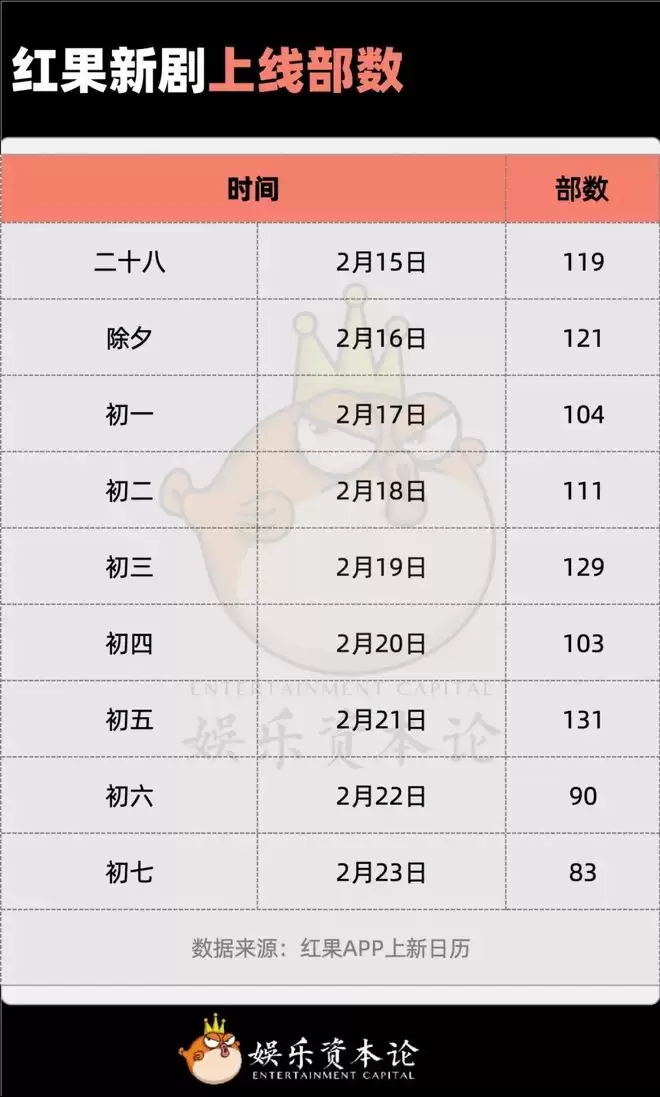 首先,根据红果上线日历,从大年二十八到正月初七,红果日均上线110部短剧,按部数推算,春节档期间(2月9日至2月23日)至少有1600部短剧上线。