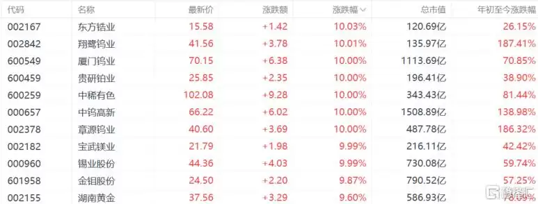 截至发稿,章源钨业连续7天涨停5次,中钨高新、锌业股份连续3天涨停2次,东方锆业、厦门钨业、翔鹭钨业、贵研铂业、中稀有色、锡业股份、宝钛股份、宝武镁业等十余只个股涨停;湖南黄金涨幅超过9%,北方稀土涨幅超过5%。
