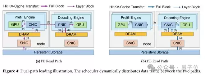 路径 A(传统):存储→PE,缓存直接读入预填充引擎。路径 B(新增):存储→DE→PE,缓存先读入解码引擎的缓冲池,再通过RDMA传输给预填充引擎。