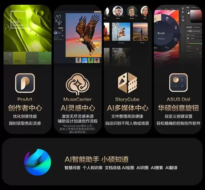 作为一款AI专业创作本,华硕ProArt 创13 2026内置多款AI应用,其中小硕知道AI智能助手整合了智慧问答、文档总结、AI 绘图、AI 识图、AI翻译、AI本地文件搜索等丰富功能,支持端云一体运行——断网环境下仍能使用核心AI功能,处理文档/数据时更安全。不仅如此,该机还打造了全栈创意生态,ProArt创作者中心可实时监控设备状态、优化性能输出,即将上线的MuseCenter AI灵感中心能智能梳理创意碎片,StoryCube AI多媒体中心可自动分类素材,让创作全流程更高效。此外,该机还配备华硕独家创意旋钮,深度适配Adobe全家桶、剪映等专业创作软件,旋转即可实现数十项快捷操作。目前购机还能免费领取6个月剪映会员,解锁更多专业创作功能,专业创作更省心。