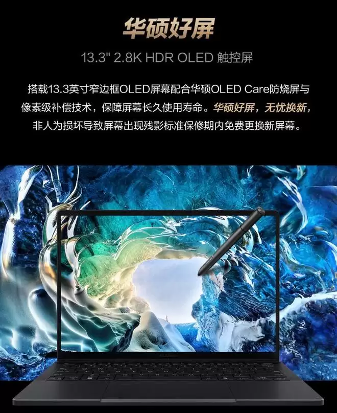 屏幕作为创作者的视觉核心,华硕ProArt 创13 2026配备的是13.3 英寸2.8K(2880×1800)OLED华硕触控好屏,覆盖100% DCI-P3广色域,支持4种专业色域切换,逐台出厂校色确保ΔE<1专业色准,还通过潘通色彩认证,修图、调色、设计时能精准还原创作意图。屏幕支持十点触控+ASUS Pen触控笔适配,手绘更方便。