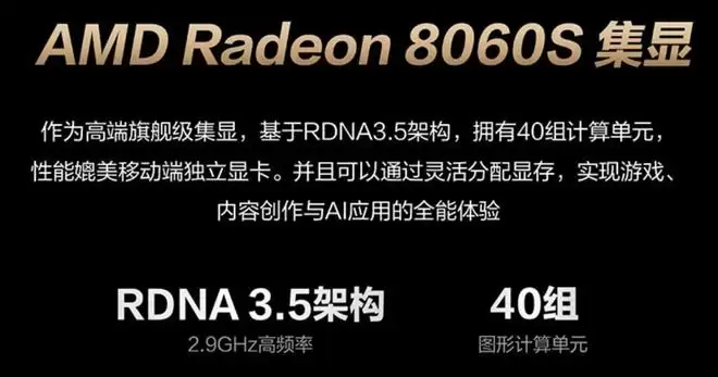 锐龙AI Max+ 395集成的Radeon 8060S集显(40CU)更是专业创作利器,图形性能媲美入门独立显卡,既能够运行复杂模型光影渲染等高负载图形任务,也能支持胜任本地运行大语言模型、AI绘图等创作任务,并且无需依赖云端网络,响应速度更快,隐私保护也更到位,可以大幅度提升用户的创意落地效率。