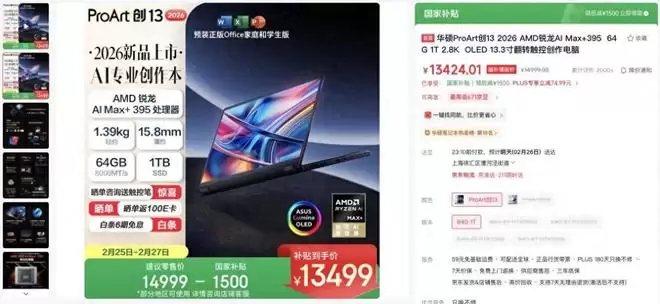 今年全新一代笔记本已经陆续上市,华硕推出了多款重磅新机。对于追求旗舰性能、全场景适配的各类专业创作者、电子产品爱好者来说,华硕ProArt 创13 2026堪称小尺寸AI专业创作本新标杆——该机重量仅1.39kg,不仅搭载16核心32线程的锐龙AI Max+ 395处理器,更拥有85W强力性能释放,首发价格14999元,部分地区可享国补优惠立减1500元,到手价格低至13499元,专业创作属性拉满,追求全能创作体验的用户别错过。