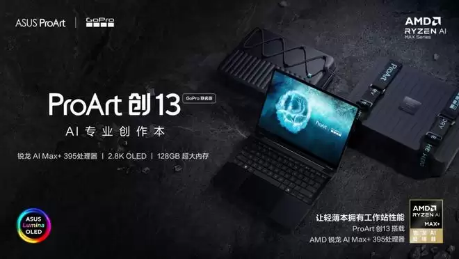 另外,华硕ProArt携手GoPro打造全新华硕ProArt 创13 GoPro联名版 AI专业创作本,2月25日也已于京东商城正式开售。1.39kg轻薄机身采用GoPro联名设计,并配备AMD锐龙AI Max+ 395处理器、2.8K OLED触控华硕好屏、搭配至高128GB LPDDR5X 8000MT/s内存和1TB PCle 4.0高速SSD,为户外移动创作提供充沛性能支撑与高速读写能力,轻松驾驭多轨视频剪辑、超大素材实时预览、全景视频渲染等创作需求,让创作者在户外、旅途等移动场景中,凭借专业级工作站的强悍性能,实现随时随地高效创作。