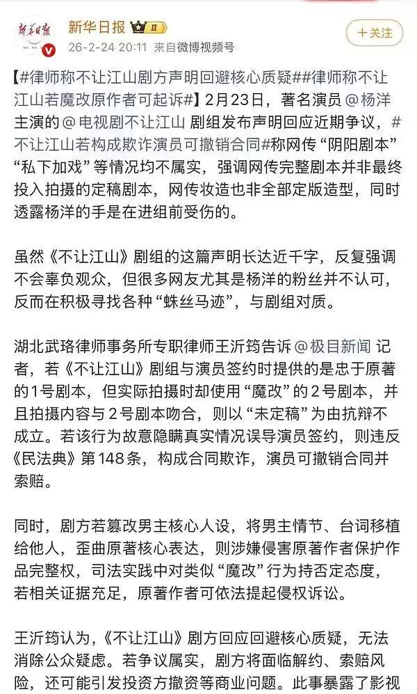 一个请来律师解读、直指剧组声明回避核心质疑、魔改行为或涉嫌合同欺诈与侵权……