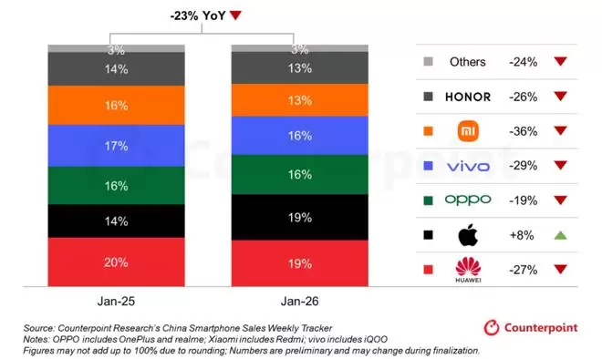 市场研究机构 Counterpoint Research 预计,3 月后中国市场新品手机均价将较 2025 年同档位机型上涨 15% 至 25%。