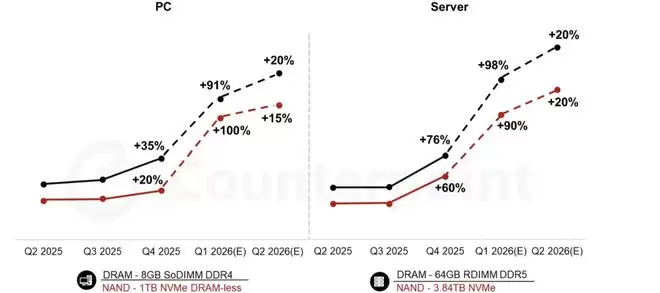 市场研究机构:部分存储器价格春节前后翻倍有余,供应短缺或持续至2027年下半年 春节前后的存储器市场,上演了一场令人咋舌的价格“狂飙”。根据市场研究公司Counterpoint Research在近日一场线上研讨会中披露的数据,部分存储器产品的价格涨幅超过100%,而这股供应紧张的势头,预计将延续到