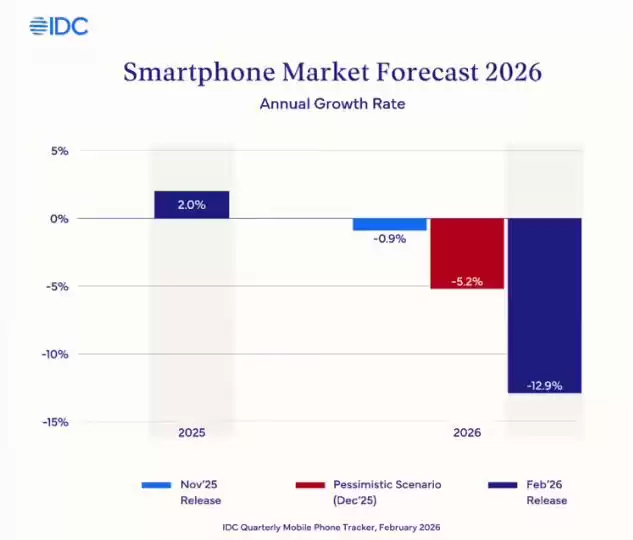 消费者方面,IDC 预测:受价格波动影响,2026 年全球智能手机市场下滑 12.9%,营收微降 0.5%。2026 年中国手机出货量可能出现 2.2% 左右的下滑。消费者换机周期可能进一步拉长,从 36 个月向 40 个月以上推移。