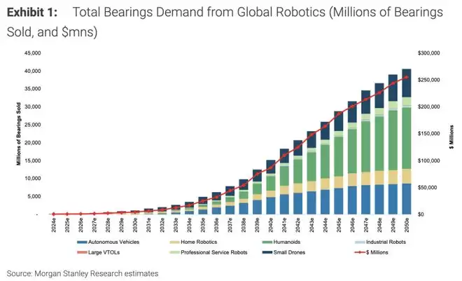 这组数据看起来相当激进。但它背后的逻辑并不复杂:摩根士丹利此前的研究预测,到 2050 年全球机器人装机量可能达到约 65 亿台,涵盖家用机器人、小型无人机、人形机器人、自动驾驶汽车、工业机器人、专业服务机器人和大型垂直起降飞行器(VTOL)等多种形态。如果每台机器人平均消耗数十个轴承,总量确实是天文数字。