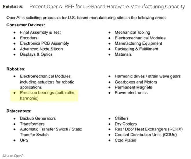 在机器人板块,OpenAI 明确列出了六类关键零部件需求,精密轴承赫然在列,与电机械模块、谐波减速器/应变波齿轮、齿轮箱、永磁体、功率电子器件并列。