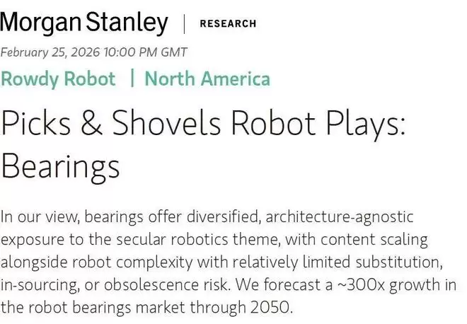 2026 年 2 月 25 日,摩根士丹利发布了一份标题颇为直白的研报:《Picks & Shovels Robot Plays: Bearings》(“铲子与镐”式机器人投资机会:轴承)。所谓“铲