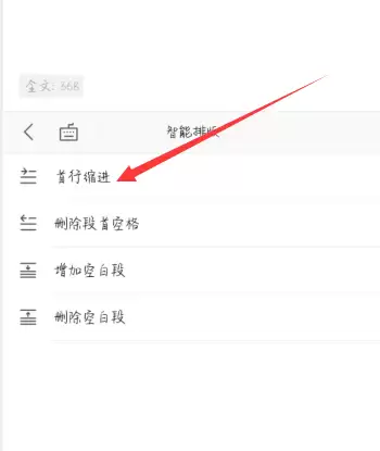 点击“智能排版”后,在出现的设置窗口中,选择“首行缩进”选项,为文档应用首行缩进格式。