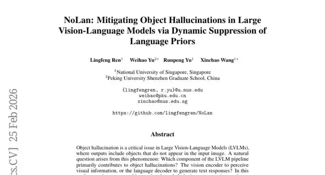 人工智能的"幻觉"问题一直困扰着科学家们,特别是当机器需要"看图说话"时。新加坡国立大学和北京大学深圳研究生院的研究团队在2026年2月发表了一项突破性研究,论文编号为arXiv:2602.22144v1,题为"NoLan: Mitigating Object Hallucinations in Large Vision-Language Models via Dynamic Suppression of Language Priors"。这项研究彻底改变了我们对AI视觉语言模型"胡编乱造"问题的理解,并提出了一个简单而有效的解决方案。