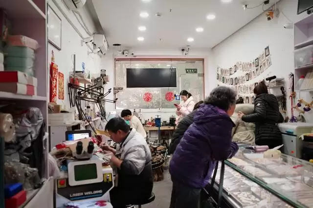 “过年放了几天假去旅游,本来想正月初八开门,结果初七就有老顾客来催,所以提前了一天。”周宝林忙得脚不沾地,就连午饭也来不及好好吃,只能啃几口饼了事。记者在店内等了一个多小时才和他说上话。“现在金价高,外面品牌金店溢价高,很多人都是来打金店置换、改款,我们实惠一些。”他说,“性价比”是消费者选择打金的主要原因,“年前年后有个黄金消费热潮,店里特别忙,人多的时候,店里三个接待员都忙不过来。”