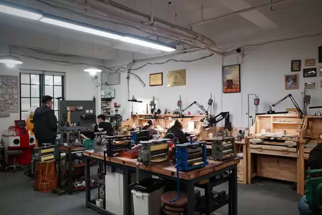 从拥挤的豫园打金店走入位于申报馆五楼的“周末打金”,空间一下子开阔疏朗起来。约130平方米的工作室是当下年轻人喜欢的原木风装修风格,销售人员会带顾客坐在沙发区,翻看平板电脑了解式样和工费。每个打金师傅都有自己专属的木质工作台,开着高级护眼灯作业,台面上除了琳琅满目的工具,还有空间摆下绿植、小手办等私人物件。