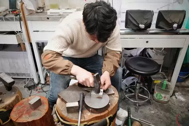 “周末打金”主理人李晶是“90后”,从上海工艺美术职业学院首饰专业毕业后,一个偶然的机遇进入黄金加工行业。店铺名“周末打金”源自她儿子的名字,也希望顾客能每天保持周末般的愉快心情。一开始,这家打金店也开在城隍庙豫园一带,面积只有30多平方米,大约三年前,李晶决心把店铺从街边搬到写字楼,尽管租金、物业费要贵很多,但面积更大、整体环境提升,顾客会有更好的体验,手工匠人们也能获得更好的工作环境。