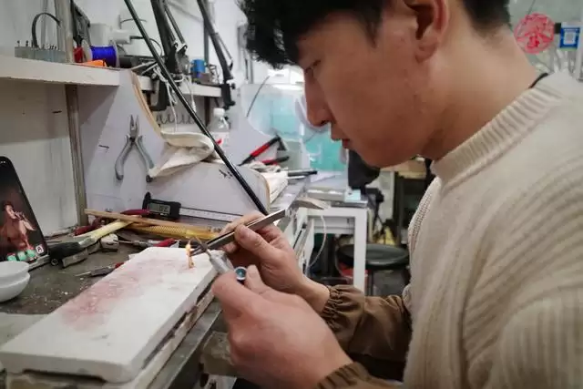 周宝林从2013年起入行,最早是开银饰店,也做金银的销售、加工,慢慢地发展为打金店,店铺从闵行搬到了豫园。“我现在有4家门店,在嘉定安亭也开了一家。”他的业务比较广泛,做黄金回收、做打金生意,也做首饰镶嵌和维修。