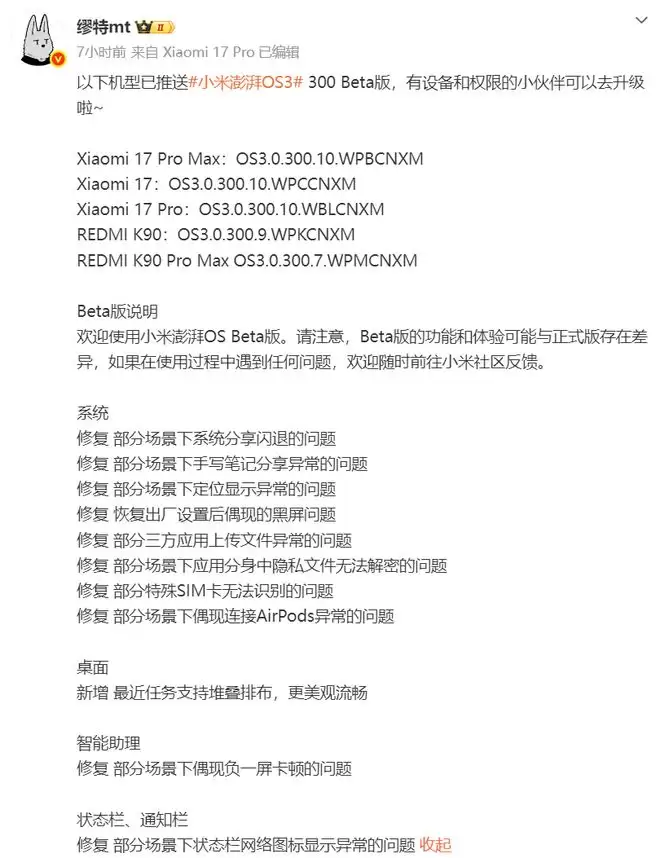 先看名单,这次Beta版推送覆盖了五款手机和两款平板,分别是Xiaomi 17 Pro Max:OS3.0.300.10.WPBCNXM;Xiaomi 17:OS3.0.300.10.WPCCNXM。