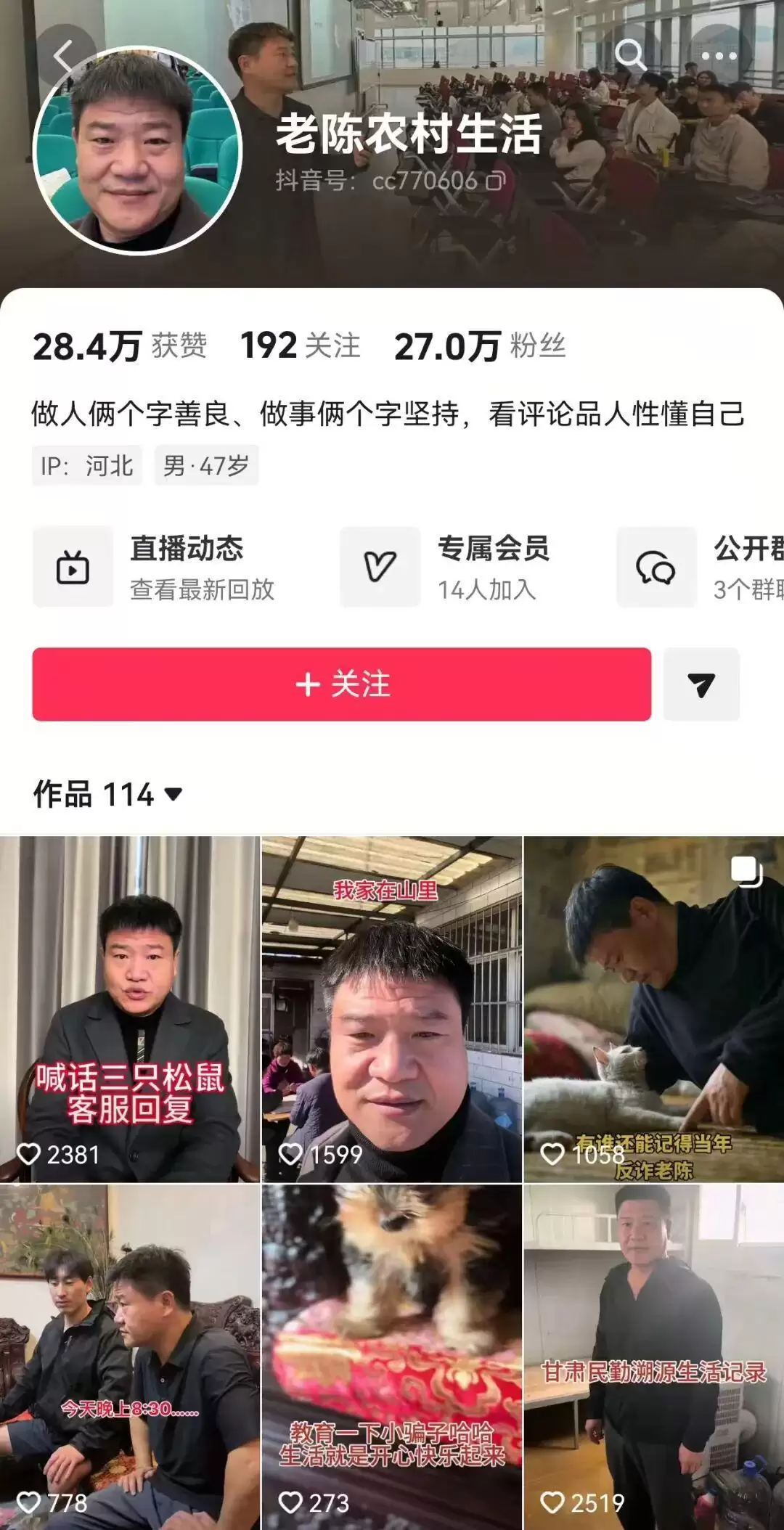 不过目前,老陈的视频号等平台账号状态正常。对于在抖音被封号一事,他表示将起诉抖音平台。