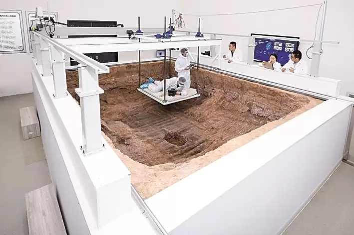 在山西垣曲北白鹅墓地的考古发掘现场,一座密闭方舱将椁室整体包裹——这是山西自主研发的第二代地下考古方舱。舱内温湿度精准控制,新风系统持续过滤灰尘和微生物,为脆弱有机质文物构筑起“恒温恒湿防护罩”;滑轨式发掘平台让考古人员悬空作业,避免传统踩踏风险;超景深显微镜下,器物表面微米级痕迹清晰可辨。