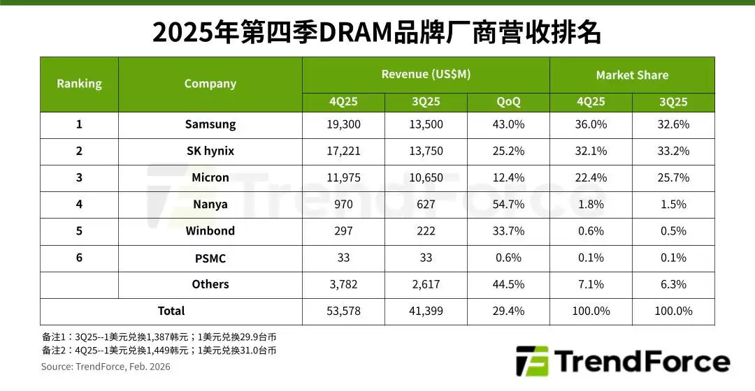 从厂商表现来看,三星凭借强劲的价格涨幅和HBM业务的带动,成功重返行业榜首。去年第四季度,三星营收增至193.0亿美元,季增幅高达43.0%,营收市占率回升3.4个百分点至36.0%。其平均售价季度增长约40%,居三大原厂之首;位元出货量在HBM业务带动下实现个位数低段增长,符合市场预期。