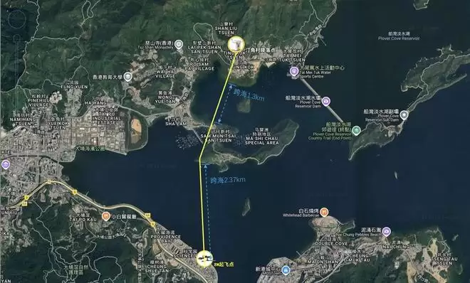 从香港科学园出发,无人机直线飞越吐露港和船湾海,直达汀角村的村口,完成这段路程仅用时 10 多分钟。这条美团无人机与香港青少年服务处合作设立的“大埔汀角村无人机航线”,也是全港首条服务于老年人送餐的低空物流航线。