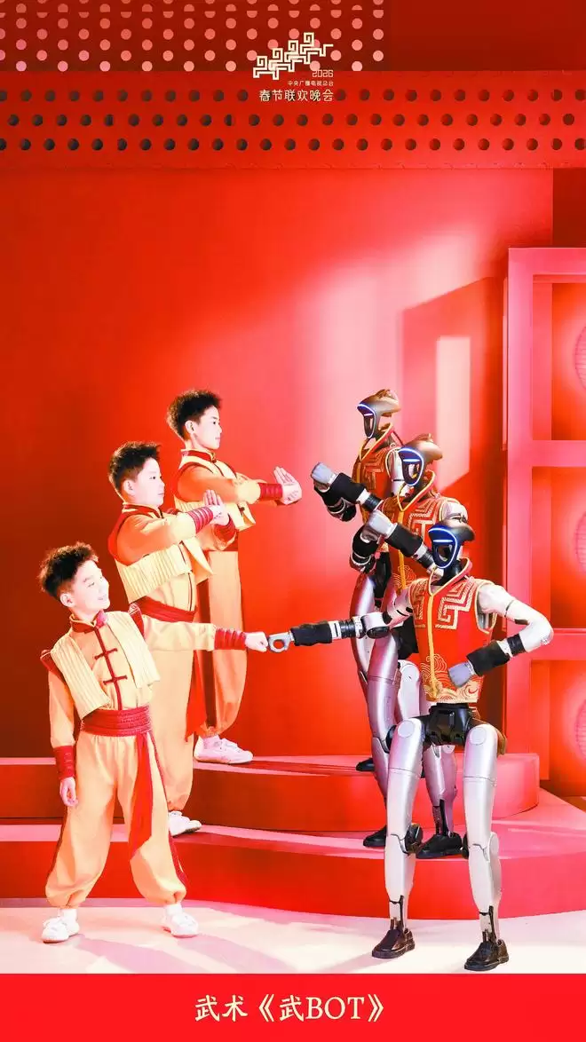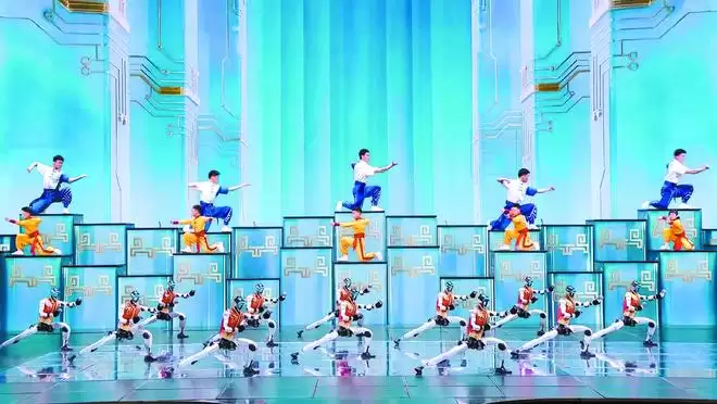 春晚《武BOT》节目中,人形机器人与演员们同台展示武术动作。