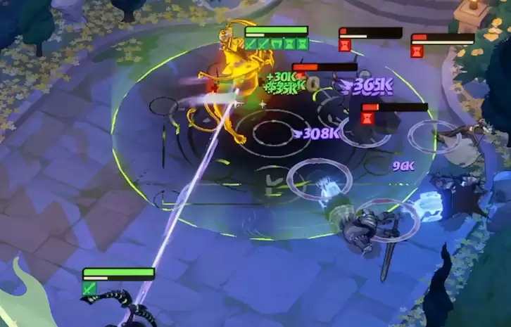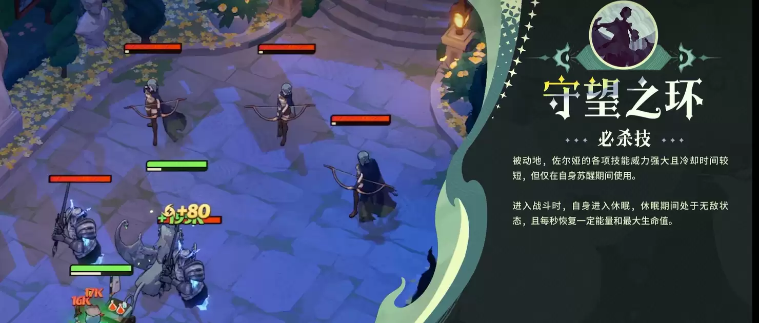 她的大招名叫“守望之环”,集无敌、范围伤害和眩晕三种效果于一身。这里有个独特的机制需要单独说明:佐尔娅开局会进入“休眠”状态,这段时间内队友是4打5的局面,等她从天而降才算正式参战——听起来是不是有点“觉醒斧神”的感觉?休眠期间她会触发无敌效果,即使队友全部阵亡,她也能凭借这个机制回满血量和能量,然后重新下场。另外,持续为佐尔娅补充能量可以缩短她的休眠时间,这一点在组队搭配上会有一定的发挥空间。