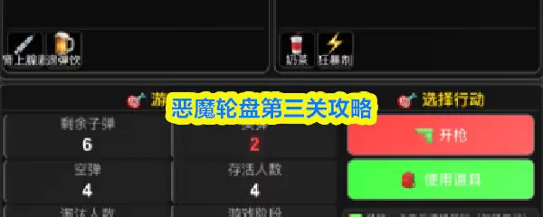 恶魔轮盘第二关双方各4血,每回合可选2个道具。首轮实1空1,可用道具查弹或控场;次轮实2空2,建议先自射试探;第三轮实3空2,优先攻敌并计算概率;后续根据弹量灵活选择,实弹占优时果