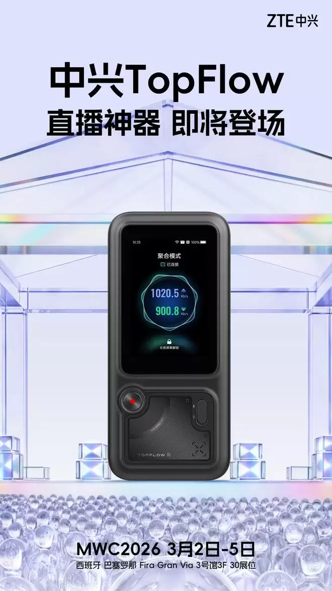 IT之家2月28日发布消息称,中兴通讯今日预热了一款即将在MWC 2026世界移动通信大会(3月2日开幕)亮相的产品——名为TopFlow的“直播神器”。