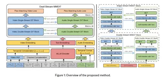 SkyReels-V4则采用的双流 MMDiT 架构,可以实现视频和音频两条线从任务开始就并肩工作,共享同一个大脑(文本理解模型)。且通过互相参考的双向跨注意力机制,提高生成视频中角色的嘴型、动作和声音的匹配度。