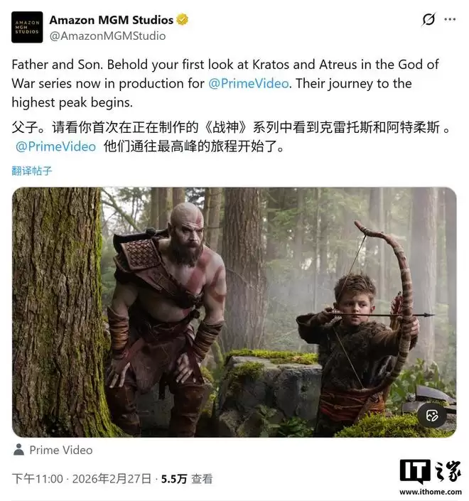 IT之家 2 月 28 日消息,亚马逊 Prime Video 昨日(2 月 27 日)在 X 平台发布推文,公开了《战神》真人剧集中奎托斯(Ryan Hurst 饰)与阿特柔斯(Callum Vi