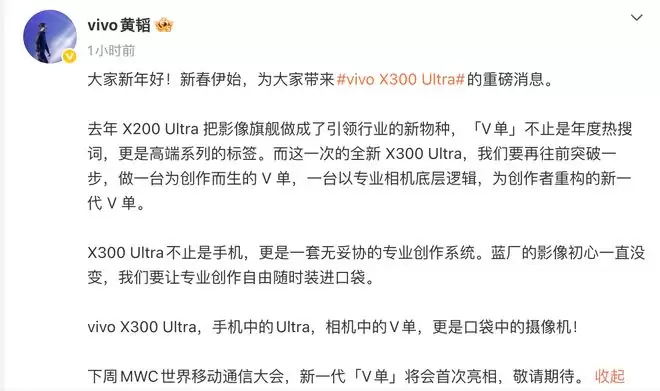 据悉,在即将举行的MWC世界移动通信大会上,新一代"V单"vivo X300 Ultra将首次亮相。