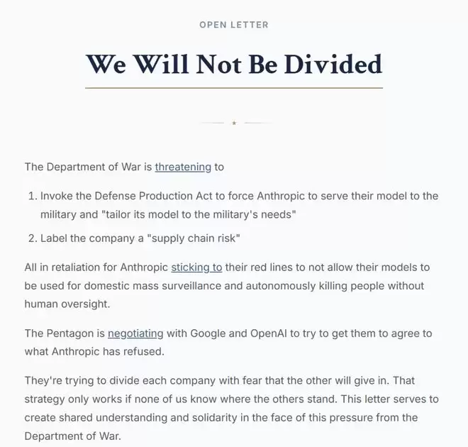 员工们在信中尖锐地指出,五角大楼正在试图利用 AI 公司之间的竞争关系,通过「你不干有的是人干」的恐惧心理来分化他们。员工们要求自己的公司高层不要趁人之危,而是应该像 Anthropic 一样坚守清晰的道德底线。