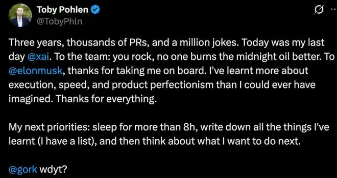 此外,xAI 的另一位联合创始人 Toby Pohlen 刚刚宣布离职,这是本月第三位离职的联合创始人。xAI 的 12 位联合创始人中,已有 6 位离开。