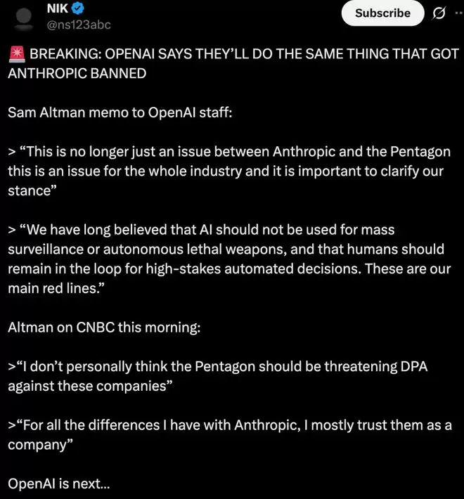 到了本周,奥特曼却在致 OpenAI 员工的备忘录中表示:「这不再仅仅是 Anthropic 公司和五角大楼之间的问题,而是整个行业的问题,因此表明我们的立场非常重要。我们一直认为,人工智能不应用于大规模监控或自主致命武器,在涉及高风险的自动化决策中,人类应该始终参与其中。这些是我们的主要底线。」