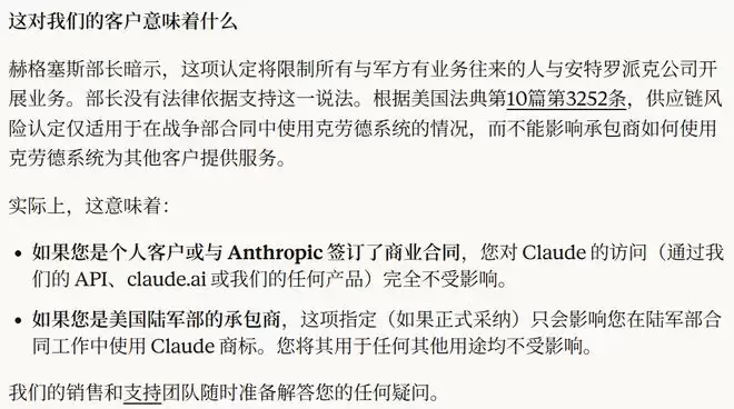 这一宣布后不久,美战争部长海格塞斯将该公司列为「对国家安全的供应链风险」,这意味着任何与军方合作的承包商或供应商都不得与 Anthropic 进行业务往来。