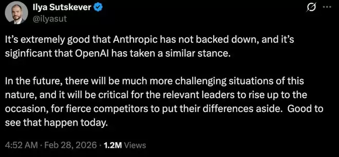 神隐许久的伊利亚也在 X 上声援 Anthropic。